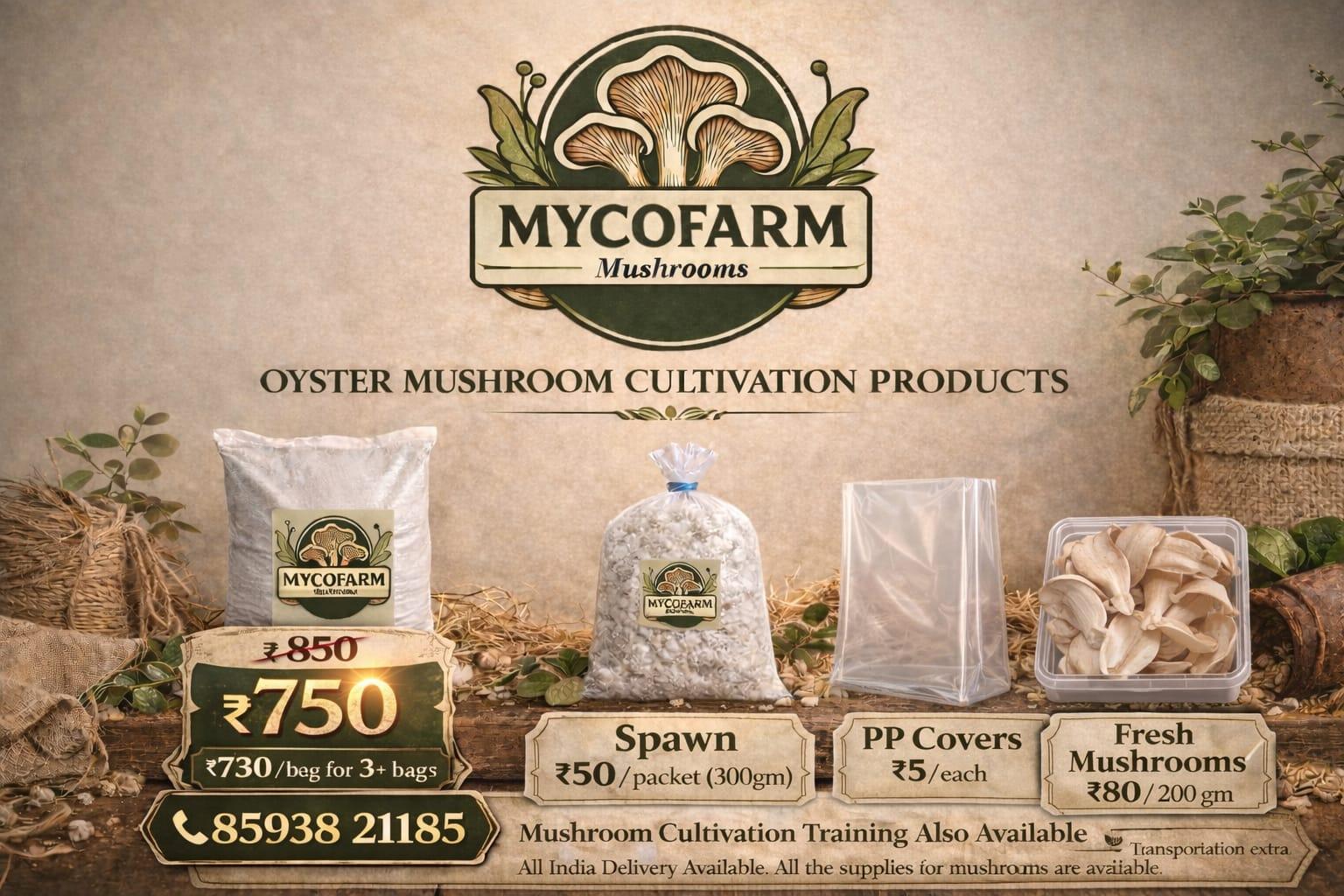 Mycofarm is a trusted supplier of fresh oyster mushrooms and premium mushroom cultivation products. We offer fresh mushrooms, high-quality spawn, pellets, PP covers, and other essential farming materials for growers, retailers, and bulk buyers. Our focus is on quality, hygiene, freshness, and timely delivery. We are committed to supporting mushroom farmers and businesses with dependable products and excellent customer service.